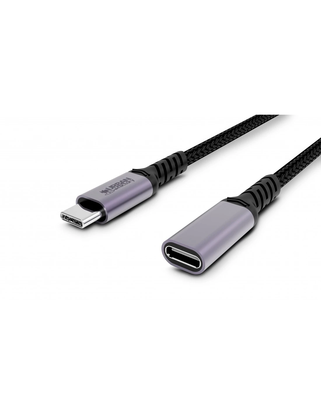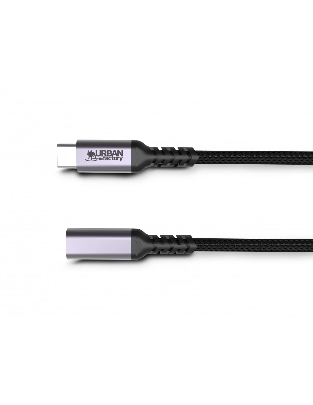 Rallonge USB-C (F) vers USB-C (M). Câble fabriqué en nylon tressé d’une longueur de 1mètre (3.3ft). Câble E-Mark de 5A qui supporte jusq’à 100W en courant passant. Tête en alumium gris sidéral.